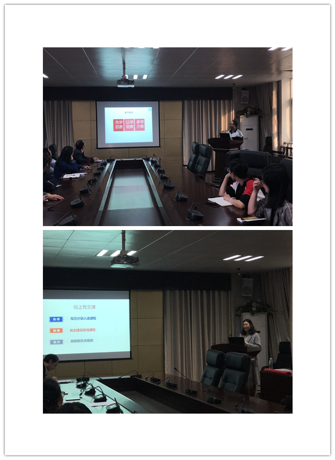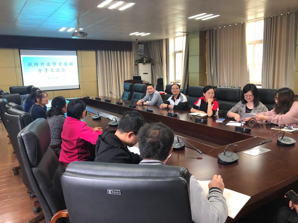 本网讯(通讯员 杨萍)根据教师外出参加“高校金课混合式教学设计与实现工作坊“培训情况,10月31日在太阳集团tyc33455六楼会议室,由化学教研室的冯春和徐伟两位老师做本次学习培训的分享交流会。太阳集团tyc33455全体无课教师参加,活动由赵万红书记主持。