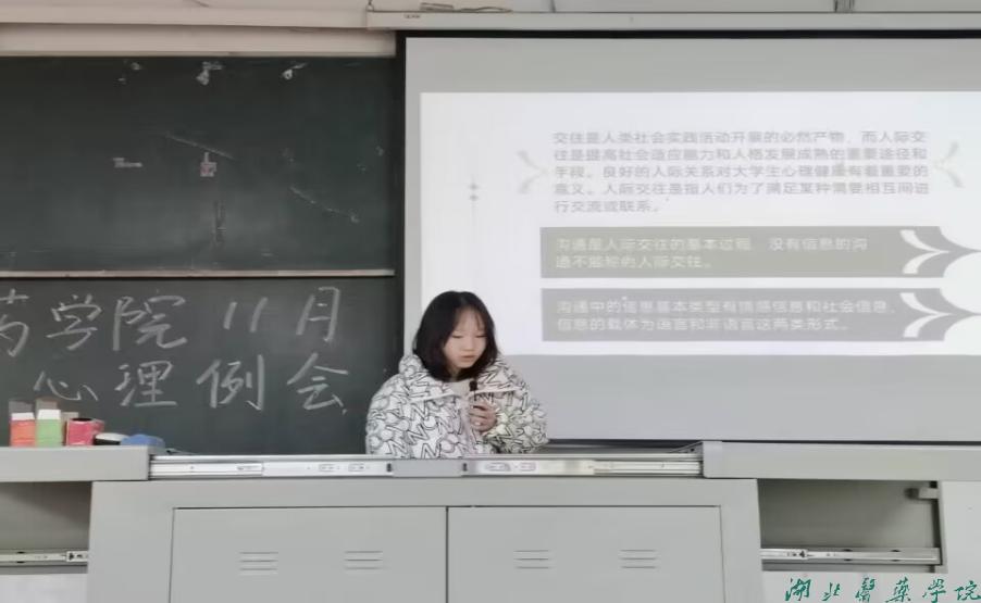 本次会议由心理健康部成员夏雨甜主讲,主要带同学们重新了解了人际交往,知道了人际交往的变革与普及,还有它的重要位置,良好关系,以及人际交往的三种需求。最后,提出大学生人际交往常见问题是不敢交往和不愿交往,通过和各班级心理委员的互动,大家进一步知道了如何去处理人际交往问题,并给出了不同的见解。胡老师对本次例会进行评价,并提出了要求,希望各班级心理委员和心理健康部都认真的重视心理例会,去提升自己的表达能力和素质要求。