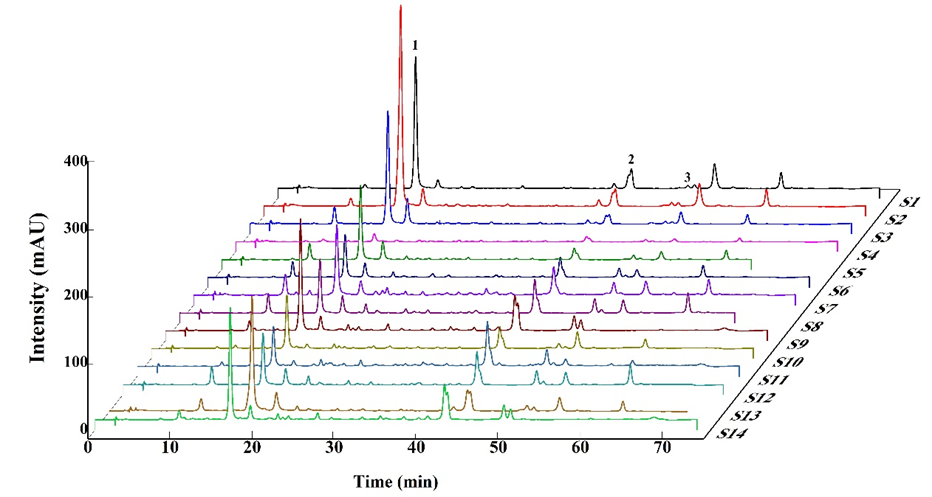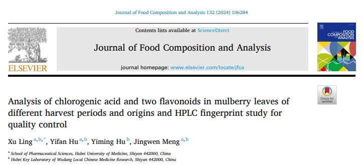 本网讯(通讯员 凌旭)桑叶是一种典型药食两用中药材,全中国大部分地区均有生产。其所含有的化学成分因产地和采摘时间不同而体现出巨大的差异。《中国药典》2020年版规定其“初霜后采收,除去杂质,晒干”后入药,并以芦丁作为质量控制的指标。然而,以单一化合物作为质量控制指标无法反映其所含成分的总体情况,且中国药典未说明其他时间段采收的桑叶能否药用。因此,需考察产地差异和采收时间差异对桑叶品质的影响。太阳集团tyc33455凌旭课题组致力于上述问题的研究,近期在中科院二区TOP期刊《Journal of Food Composition and Analysis》(5年影响因子: 4.6)上发表了题为“Analysis of chlorogenic acid and two flavonoids in mulberry leaves of different harvest periods and origins and HPLC fingerprint study for quality control”的研究成果。该研究采用高效液相色谱法和液相色谱-质谱联用技术研究了不同采收期和产地的桑叶中的芦丁、绿原酸和紫云英苷等三种成分的含量,建立了桑叶的HPLC指纹图谱,并以Box-Behnken响应面法优化了三种成分的提取率,使含量测定结果更接近三种成分的真实含量。