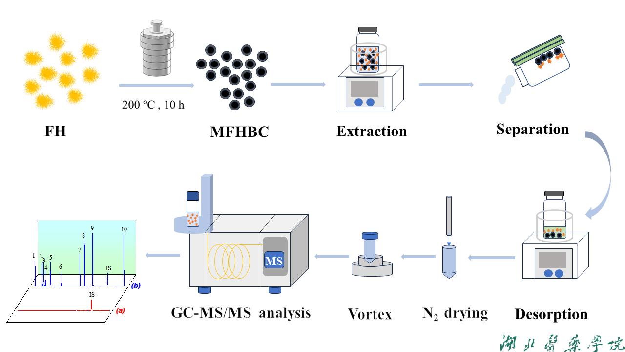 研究者受地方传统特色食品毛豆腐的启发,发现具有三维网状多孔结构的菌丝富含脂质、糖蛋白等生物活性基团,具备样品前处理材料的优异潜质。将铁离子等溶液均匀分布于菌丝中,通过一步水热碳化法制备了核-壳结构的磁性菌丝生物炭,并应用于磁固相萃取技术中。结构表征等实验证明该材料具有疏水性和良好的石墨化结构,可以与OCPs产生疏水相互作用和π-π相互作用,有利于对目标分析物的萃取。该技术克服了传统溶剂萃取法溶剂难分离的问题,且萃取效率高,可在农业污染监控、中药材及茶叶生产等领域中广泛应用。