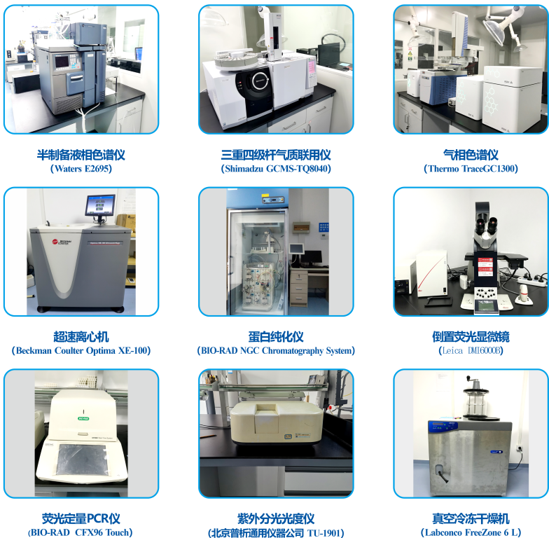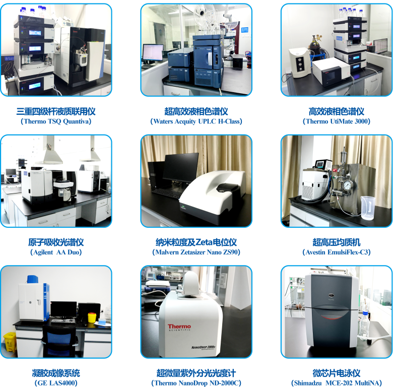 药学研究平台现有超高效液相色谱仪、三重四级杆液质联用仪、高效液相色谱仪、原子吸收光谱仪、纳米粒度及Zeta电位仪、超高压均质机、凝胶成像系统、超微量紫外分光光度计、微芯片电泳仪、气相色谱仪、三重四级杆气质联用仪、半制备液相色谱仪、超速离心机、蛋白纯化仪、倒置荧光显微镜、荧光定量PCR仪、紫外分光光度仪、真空冷冻干燥机等大型仪器。