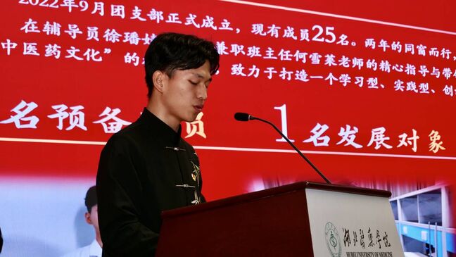 2022中药学团支部以“青春在中医药文化传承和发展中绽放绚丽之花”为主题,从把牢信仰之基础、钻研中医药知识、讲好中医药故事、助力中医药创新四个方面进行汇报。