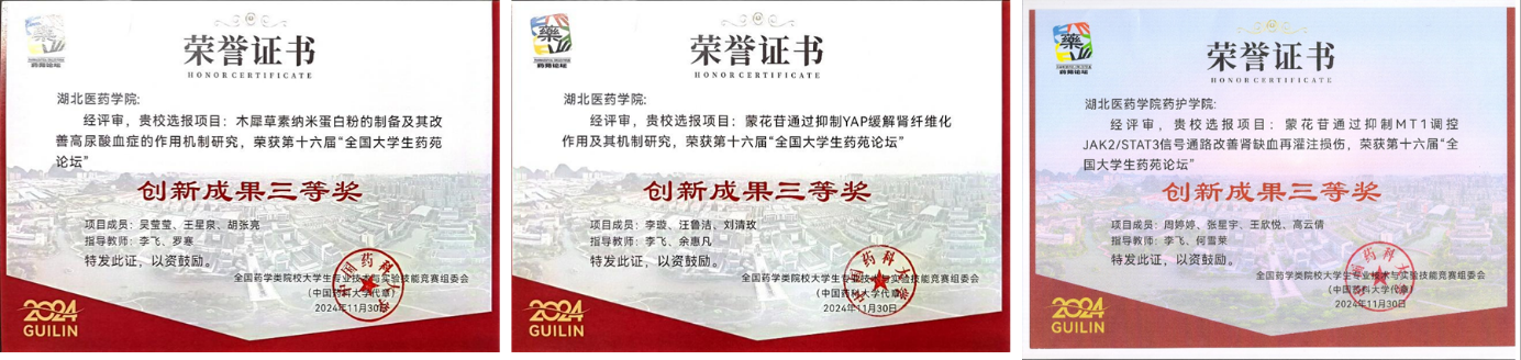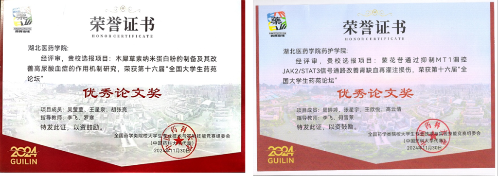 本次论坛设立“药学科学”和“药学服务”两个赛道,参赛论文作品296篇、壁报作品286项,创新成果评选作品251项。比赛环节包括壁报交流、论文评选、学生答辩等,经过层层比拼、激烈角逐,太阳集团tyc33455推荐的3个项目“木犀草素纳米蛋白粉的制备及其改善高尿酸血症的作用机制研究”(项目成员:吴莹莹、王星泉、胡张亮;指导老师:李飞、罗寒)、“蒙花苷通过抑制YAP缓解肾纤维化作用及其机制研究”(项目成员:李璇、汪鲁洁、刘清玫;指导老师:李飞、余惠凡)、“蒙花苷通过抑制MT1调控JAK2/STAT3信号通路改善肾缺血再灌注损伤”(项目成员:周婷婷、张星宇、王欣悦、高云倩;指导老师:李飞、何雪莱)均获得创新成果三等奖,其中两个项目荣获优秀论文奖,这是我校学生首次斩获优秀论文奖。