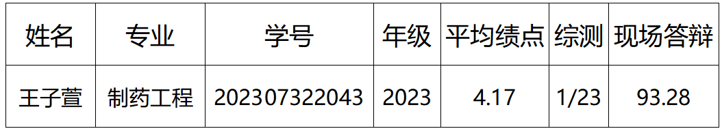 在前期学院组织的国家奖学金答辩中,综合排名前三的分别是:王艺帆96.39分、张思蕊94.39分、王子萱93.28分。现根据学校《关于开展2024-2025学年国家奖学金评审工作的通知》精神,对拟获奖推荐人选进行调整,由2023级制药工程班王子萱进行递补,现予以公示。